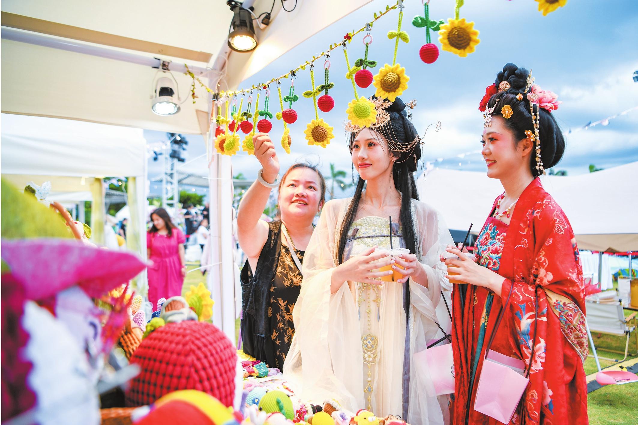 身穿傳統(tǒng)服飾的市民在2025椰城香見·海口火山荔枝夏日市集上購(gòu)物,臉上洋溢著幸福的笑容。記者 蘇弼坤 攝