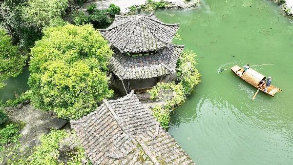 6月4日,重慶市酉陽土家族苗族自治縣桃花源景區(qū),工人對景點(diǎn)進(jìn)行水域保潔(無人機(jī)照片)。