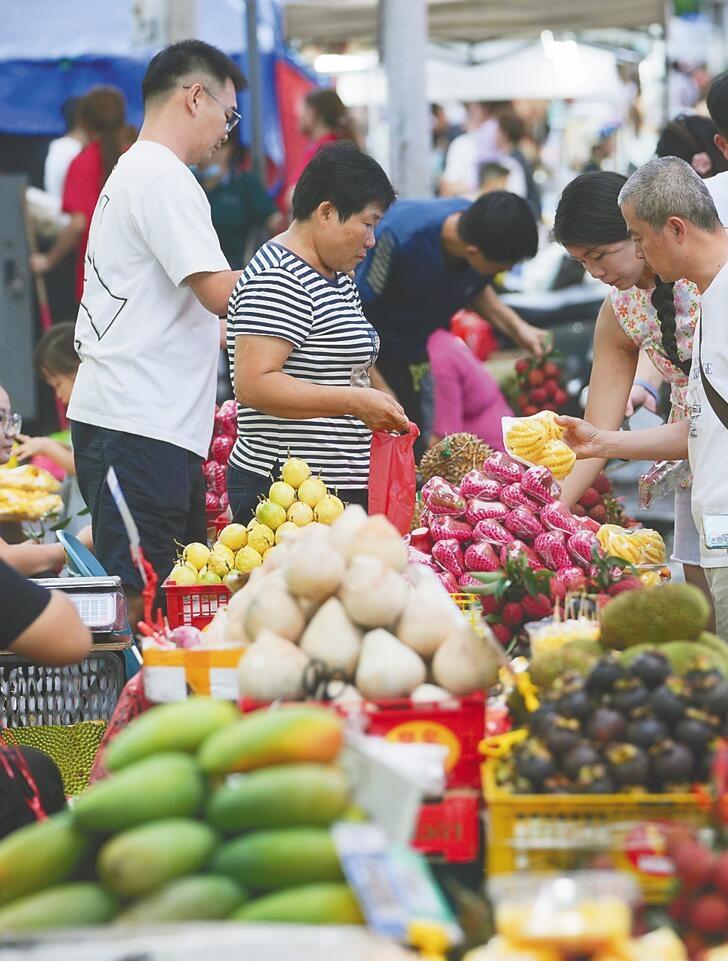 市民游客在新民街外擺水果攤位處購買熱帶水果。