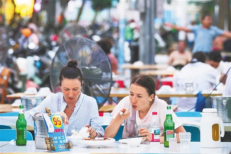 外國游客在新民街海島鮮生海鮮加工店的外擺攤位就餐。圖片均由記者王程龍攝