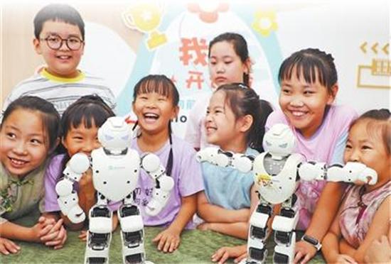 山東省東營市東營區(qū)辛店街道明珠社區(qū),小朋友學(xué)習(xí)機器人操作方法??破战逃M(jìn)社區(qū),進(jìn)一步提升居民科學(xué)素養(yǎng)。劉智峰攝(影像中國)