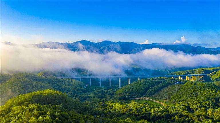 驅(qū)車行駛在瓊樂(lè)高速路上,宛如置身百里畫廊,路兩旁層巒疊翠,云霧與遠(yuǎn)山相守相望,路、橋、隧道與樹林、田野、江水、湖泊等沿途景致和諧相融,渾然一體,堪稱“海南最美高速公路”。