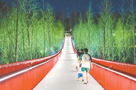離開液店再向東,過了宋莊路,就來到了涼水河畔的霧森水廊區(qū)。從涼水河主河道引出的水系,蜿蜒在綠樹間,一艘艘透明的小船在湖面上游蕩,尤其是夜幕降臨后,燈光秀一亮,水域瞬間變成了夢幻的童話世界。128米長的聽風(fēng)橋,從變幻著色彩的森林間穿過,隨便一拍就是大片。林下市集的烤肉和咖啡的香味,則讓煙火氣十足。