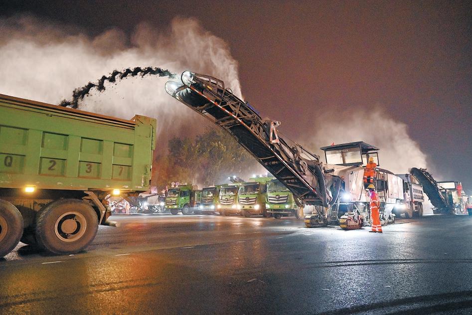 隨后,壯觀的一幕出現(xiàn)——在臨近長(zhǎng)安街的東單、崇文門(mén)等大型路口,提前待命的大型渣土車、攤鋪車等發(fā)車,沿著指定路線,首尾相接地趕來(lái),有序駛?cè)胧┕ざ?。一時(shí)間,長(zhǎng)安街上機(jī)械轟鳴,熱浪蒸騰。隨著銑刨機(jī)車底的刀盤(pán)高速轉(zhuǎn)動(dòng),老化的道路面層被“鏟”去4厘米,再重新鋪上4厘米新型瀝青。路面最寬位置,8臺(tái)攤鋪機(jī)并肩作業(yè),它們身后還跟著十多臺(tái)壓路機(jī)。