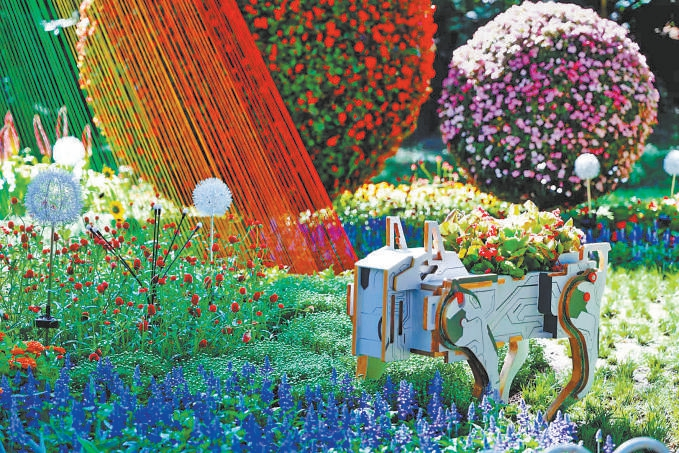 玉淵潭公園“彩色星河”花園造景中的“機(jī)器狗”花缽使用廢木料拼接。