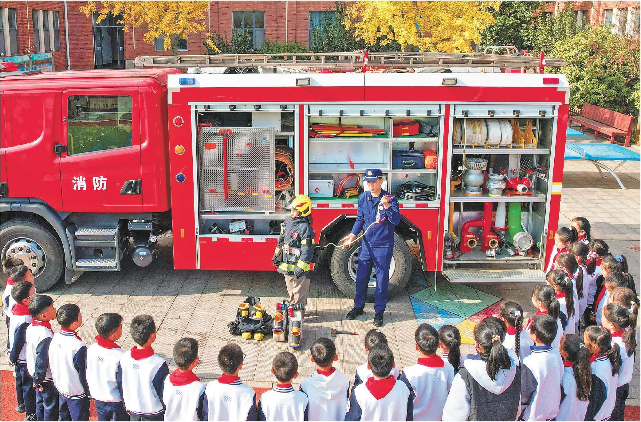 11月7日,消防救援人員為青島升平路小學學生講解消防裝備知識。