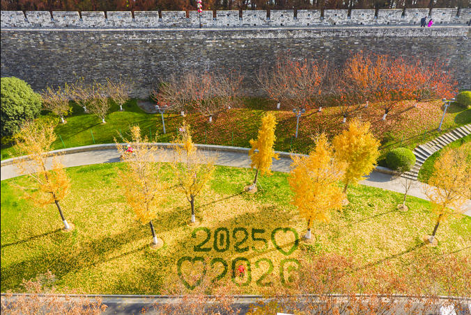 12月6日,在南京市玄武區(qū)玄武門城墻邊神武路,南京園林工人劉金頂用金燦燦的銀杏葉擺出“2025愛2026”圖案,引市民游客排隊(duì)打卡。兩組年份“2025”“2026”與兩顆依偎的愛心,在古老墻根下組成一份跨越時(shí)光的溫暖期許。(記者 閆春旭 通訊員 許韋國)