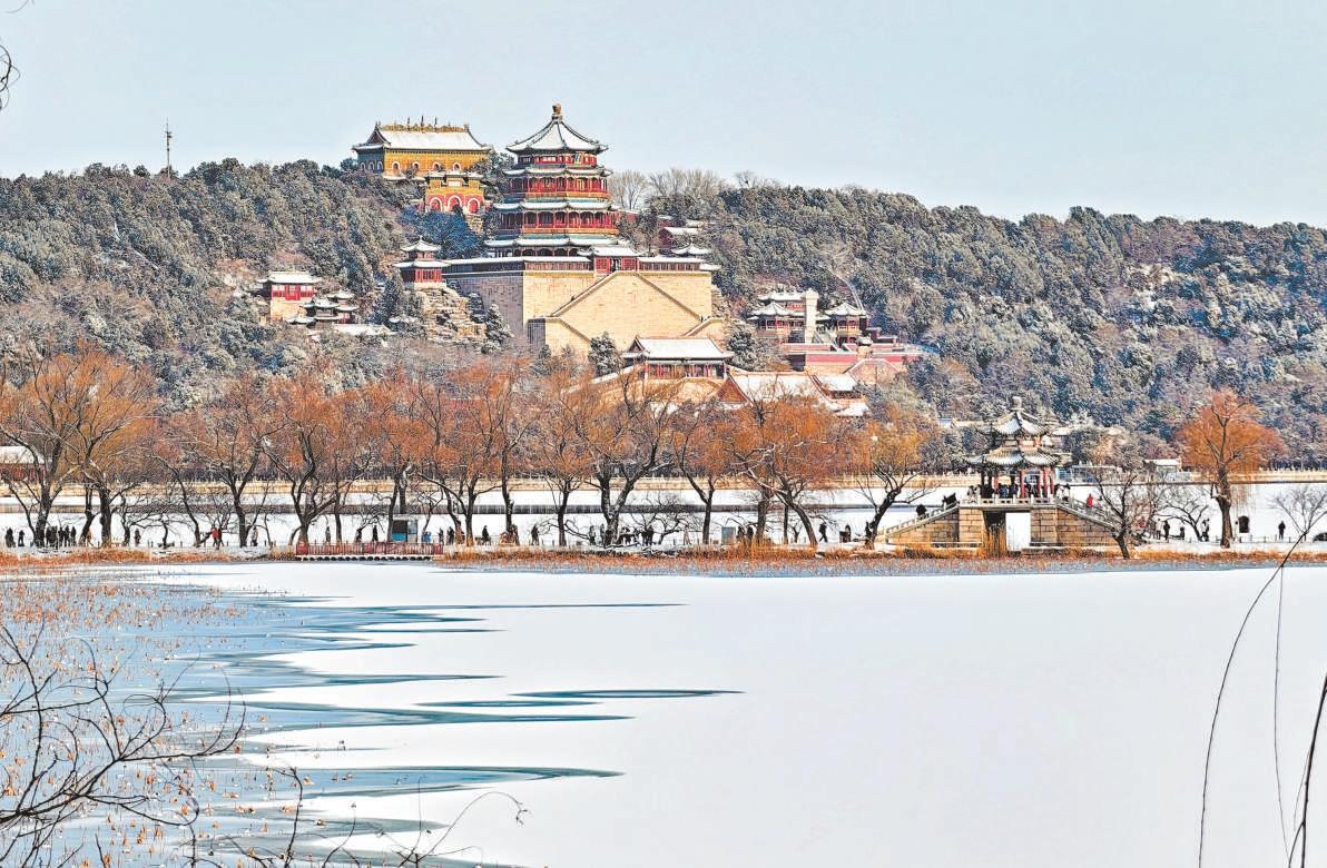 雪后初晴,頤和園萬壽山與昆明湖一片銀裝素裹,園林雪景展現(xiàn)古都風(fēng)貌。 記者 鄧偉攝