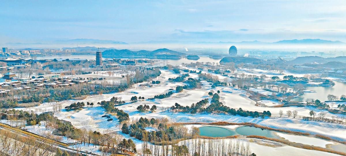雁棲湖國際會都披雪而立,清雅風(fēng)貌宛若蘊(yùn)含中式韻味的山水畫。 朱紅衛(wèi)攝