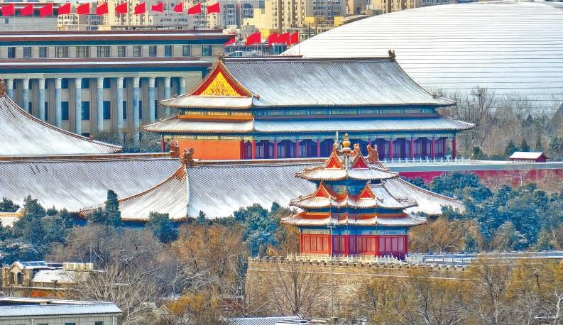 故宮角樓、天安門城樓、人民大會堂與國家大劇院雪中同框。張林平攝