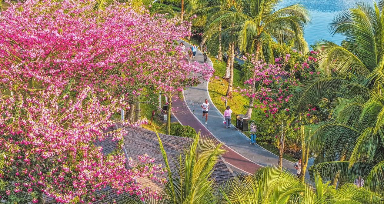 近日,??诩t城湖公園的異木棉進入盛花期,滿枝花色絢麗,與椰林、湖岸相映成趣,為冬日添了一筆暖色,也為步道增添了浪漫氛圍。市民游客在其中或慢跑健身、或漫步賞花,一幅人與自然和諧相處的動人畫卷在椰城鋪開。(記者 康登淋 攝)