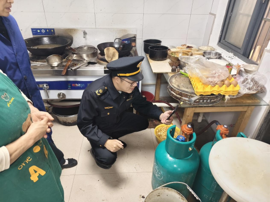 圖為執(zhí)法人員現(xiàn)場指導(dǎo)商戶燃氣安全使用的注意事項