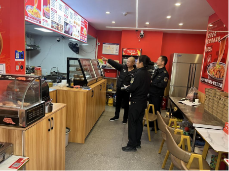 圖為執(zhí)法人員對商戶進(jìn)行指導(dǎo)