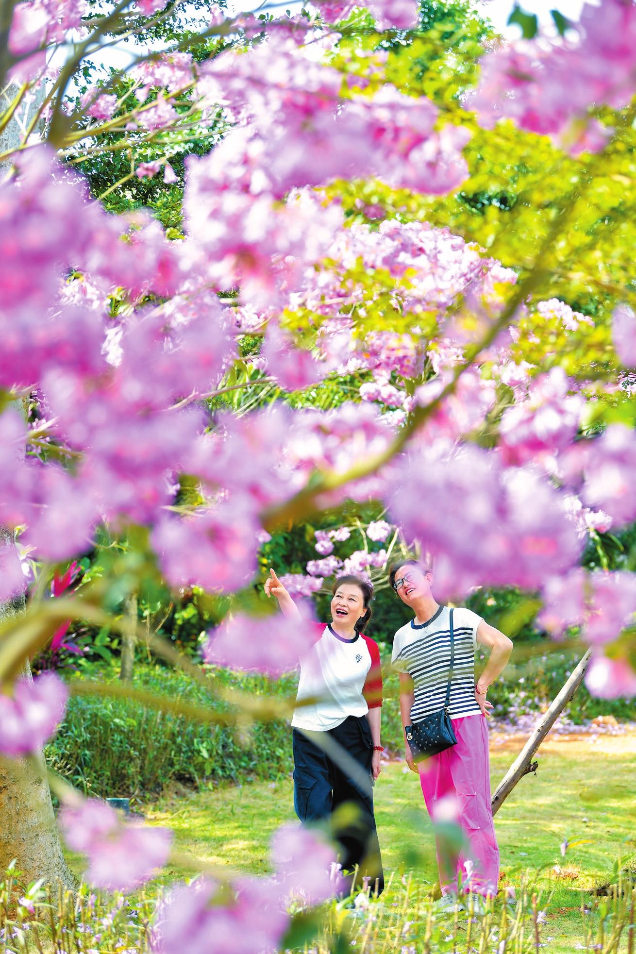 近年來(lái),??谕ㄟ^(guò)栽植各類開花喬木,用繽紛花景勾勒城市美學(xué)輪廓,催生了多個(gè)網(wǎng)紅景觀。沿著國(guó)興大道前行,一條綿延的花帶在大道兩側(cè)延伸開來(lái)。微風(fēng)吹過(guò),花瓣輕輕飄落,散落在茵茵綠草之上,猶如繁星點(diǎn)點(diǎn),別有情趣,意境動(dòng)人?!霸酒胀ǖ木G化帶,因?yàn)闈M樹繁花一下子‘活’了起來(lái),顏色豐富了,整個(gè)城市感覺更美了?!笔忻駝⒛扰e著手機(jī),興致勃勃地記錄著眼前美景。