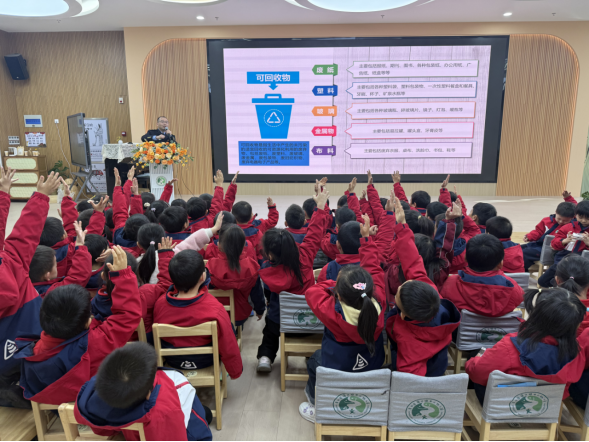 動畫片看完,互動問答環(huán)節(jié)更是點燃了全場熱情?!罢l知道我們?yōu)槭裁匆獝圩o小草呀?”“紅色垃圾桶是裝什么垃圾的?”隊員們拋出的問題剛落地,一只只小手就高舉起來。孩子們踮著腳尖、大聲搶答,稚嫩的聲音里滿是認真。對于答對的小朋友,隊員們立刻送上準備好的小禮品,拿到禮物的孩子笑得眼睛都瞇成了一條線,沒答對的也不甘示弱,等著下一個提問的機會。