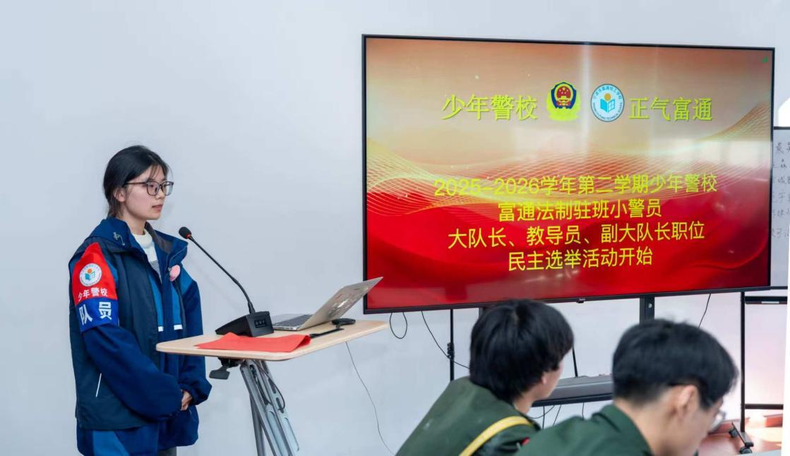本次換屆選舉嚴格遵循民主、公正、公開原則,從12名主動報名參選的學生中,通過“駐班小警員”組織內民主投票的方式產生新一屆組織領導集體。參選學生中,既有在組織中工作一年的骨干成員,也有剛進入高一階段、充滿朝氣的新生力量。競選現(xiàn)場,12名候選人依次登臺,結合自身經歷,交流參與“少年警?!备黜椈顒雍汀靶【瘑T”組織日常工作的體會,闡述對組織建設和個人成長的理解與思考。在多位候選人的發(fā)言中,因臨近高考于不久前卸任的首屆“小警員”大隊長許瑩雪同學和副大隊長馬力同學被反復提及——兩位同學在任期間,以務實的工作態(tài)度和穩(wěn)定的組織能力,為駐班小警員組織的規(guī)范運行打下了堅實基礎,也在小警員隊伍中樹立了鮮明的價值標桿。這種以實際行動傳遞責任意識和法治精神的示范效應,無疑是“少年警?!蹦J浇ㄔO中尤為寶貴的育人成果。