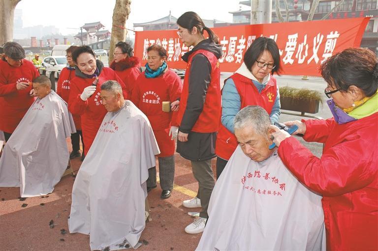 春節(jié)前,陜西省慈善協(xié)會愛心大姐志愿者服務(wù)隊(duì)組織開展上門義剪服務(wù)。圖為2月1日,愛心志愿者在西安大雁塔北廣場為小寨東路環(huán)衛(wèi)站全體環(huán)衛(wèi)工人義務(wù)理發(fā)。吳寬宏 攝
