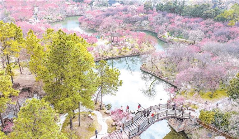 2月25日,游客在江蘇揚(yáng)州瘦西湖風(fēng)景區(qū)賞梅游玩(無(wú)人機(jī)照片)。春意漸濃,各地美景吸引人們外出游玩賞景,盡享春日好時(shí)光。 新華社發(fā)