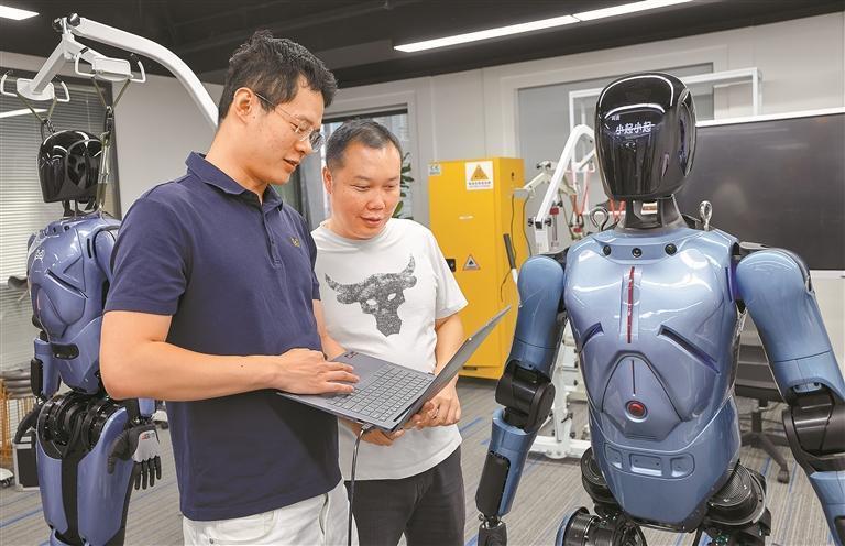 當(dāng)前,深圳人工智能飛速發(fā)展,融入市民生活、賦能產(chǎn)業(yè)升級。圖為南山區(qū)一家科技公司內(nèi),研發(fā)團隊正加緊調(diào)試機器人產(chǎn)品,為產(chǎn)品迭代與場景化落地做準(zhǔn)備。深圳特區(qū)報記者 周紅聲 攝