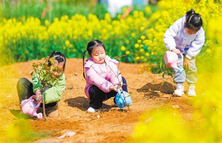 3月11日,江西省吉安市峽江縣城西幼兒園勞動基地,小朋友在為新栽種的樹苗澆水。陳福平攝(中經視覺)