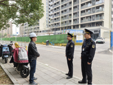 圖為執(zhí)法人員與工地項目經(jīng)理溝通工地外圍非機動車停放問題