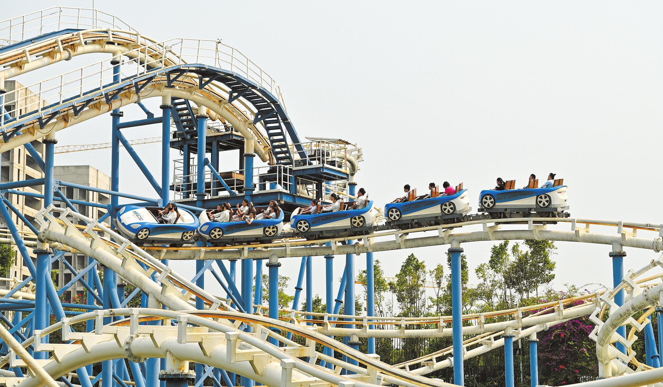 清明假期,海南長影奇幻樂園迎來踏青游玩熱潮。圖為市民游客在體驗礦山車。記者 石中華 攝