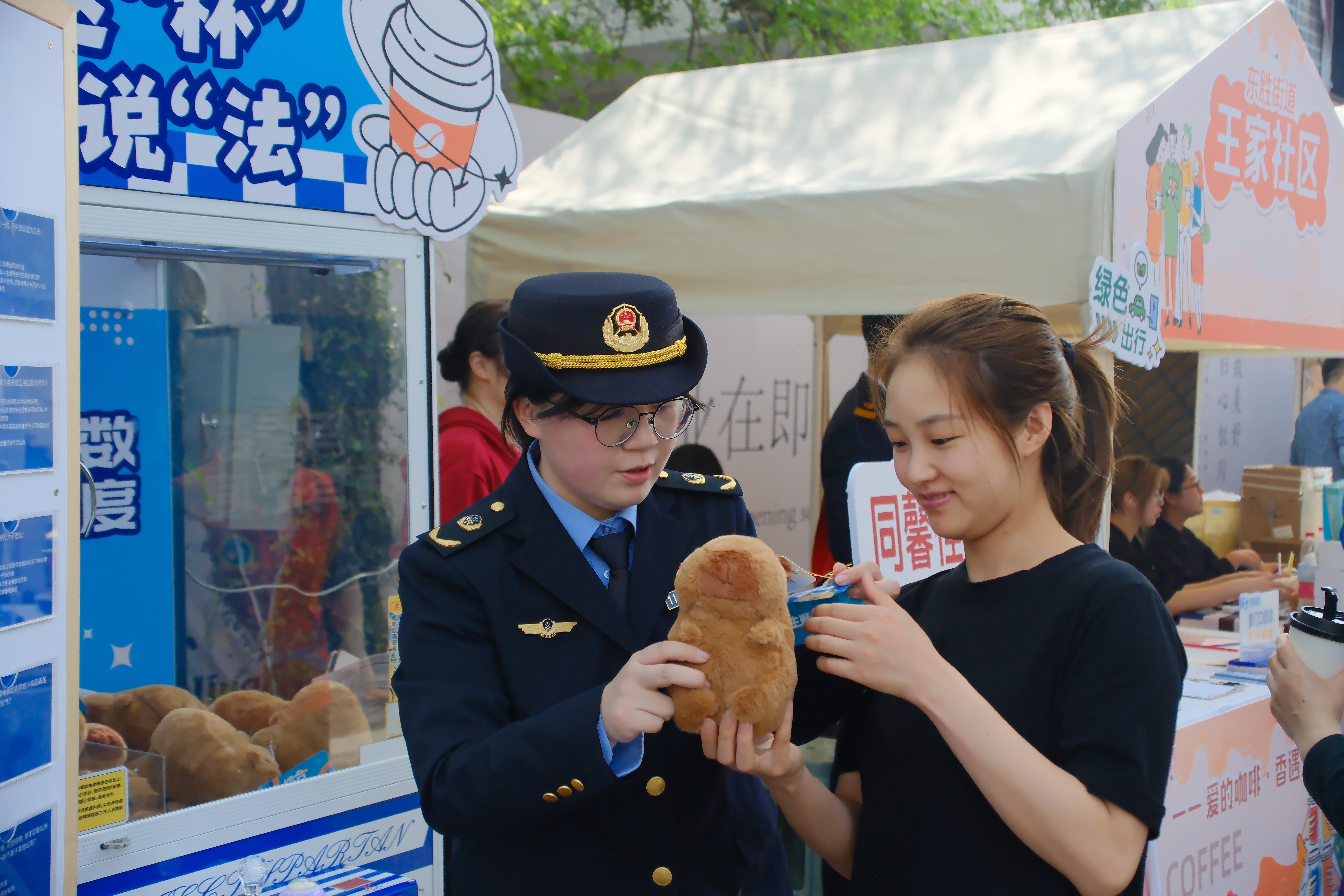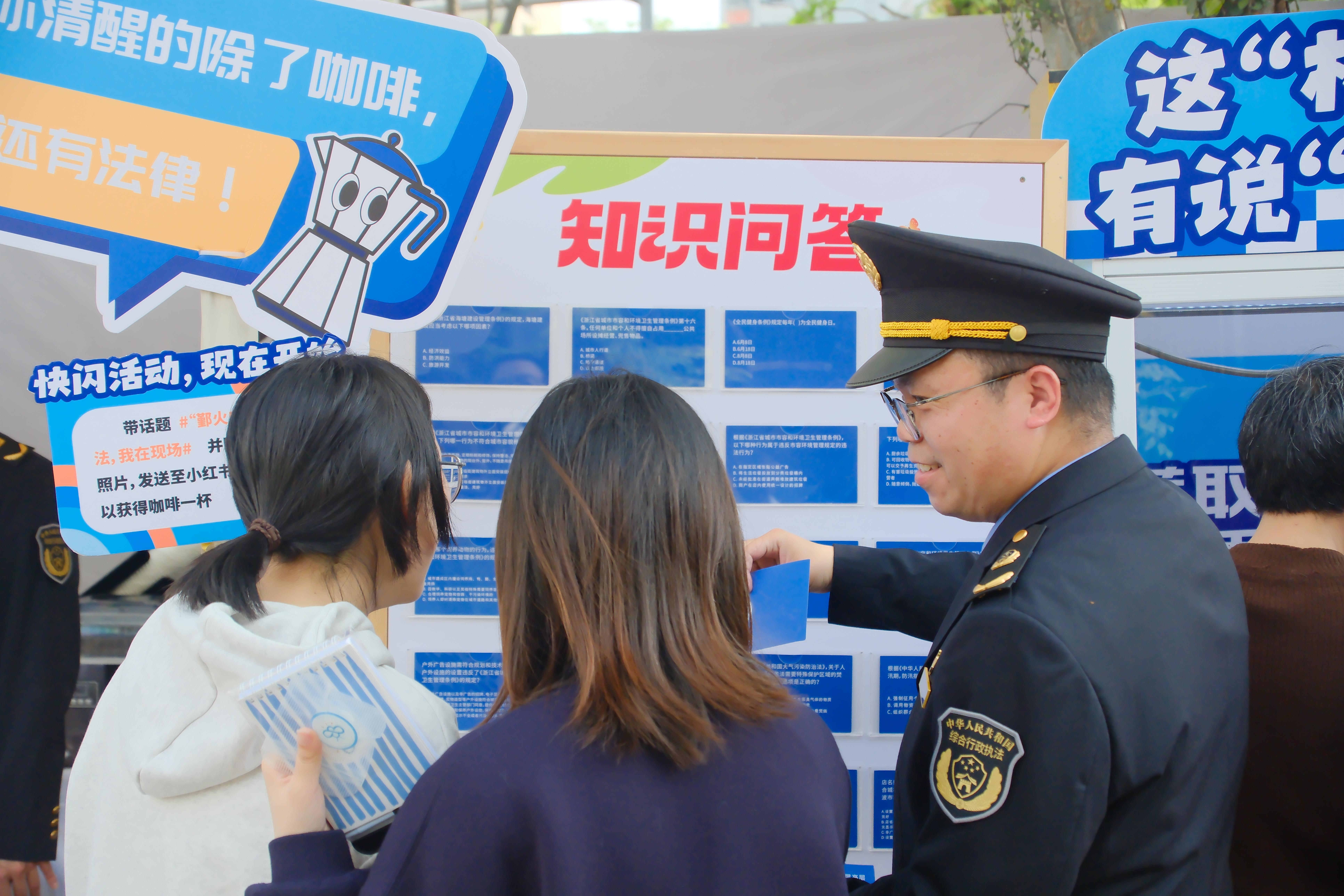 啟動(dòng)儀式后,東勝中隊(duì)打造的普法主題攤位迅速成為市集里的“人氣打卡點(diǎn)”。活動(dòng)深度融合“鄞火蟲”法治服務(wù)品牌惠民理念,執(zhí)法人員化身“普法攤主”,聚焦《寧波市養(yǎng)犬管理?xiàng)l例》《浙江省生活垃圾管理?xiàng)l例》等與群眾生活密切相關(guān)的法律法規(guī),精心推出“答題贏幣、互動(dòng)抽獎(jiǎng)”環(huán)節(jié)。市民通過(guò)參與法律知識(shí)問(wèn)答贏得娃娃機(jī)游戲幣,再通過(guò)抓取的娃娃兌換法治主題咖啡杯、普法文創(chuàng)等禮品。這種寓學(xué)于樂(lè)的方式,讓嚴(yán)肅的法條變得通俗易懂,讓法治宣傳更具吸引力,不少市民紛紛點(diǎn)贊:“逛咖啡節(jié)還能學(xué)法領(lǐng)禮品,這樣的普法形式接地氣、受歡迎!”