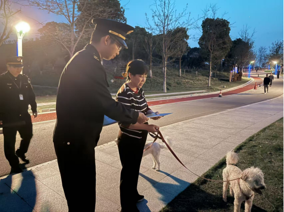 當晚,執(zhí)法人員攜帶文明養(yǎng)犬宣傳單頁,在橋西岸路、中山路、橋東岸路等城區(qū)重點路段開展集中宣傳與整治。在鳳山體育公園門口,不少市民帶著寵物散步消食。執(zhí)法人員巡查時發(fā)現(xiàn),一名中年男子牽著一只犬只,另有兩只犬只未牽繩隨行,在人群中自由穿梭?!鞍滋煸诩谊P了一天,晚上出來遛個彎,小狗這么乖,肯定不會咬人。”面對執(zhí)法人員,男子滿不在乎地解釋。