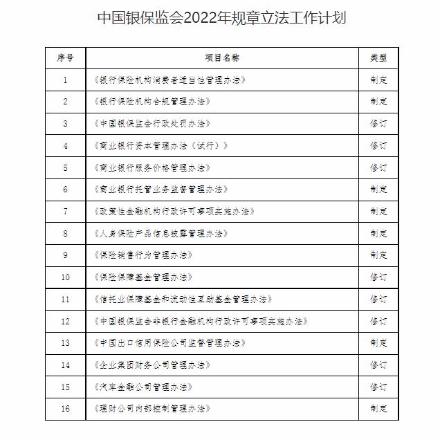 日前,銀保監(jiān)會公布2022年規(guī)章立法工作計(jì)劃。計(jì)劃包括16項(xiàng)內(nèi)容,其中修訂計(jì)劃8項(xiàng),制定計(jì)劃8項(xiàng)。