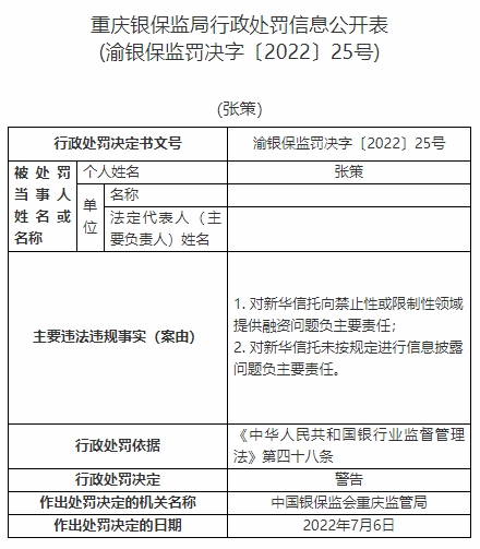 張策對新華信托向禁止性或限制性領(lǐng)域提供融資問題負(fù)主要責(zé)任、對新華信托未按規(guī)定進(jìn)行信息披露問題負(fù)主要責(zé)任。依據(jù)《中華人民共和國銀行業(yè)監(jiān)督管理法》第四十八條,中國銀保監(jiān)會重慶監(jiān)管局對其警告。