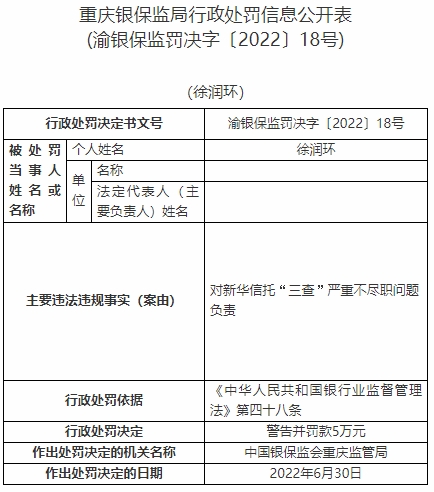 徐潤環(huán)對新華信托“三查”嚴(yán)重不盡職問題負(fù)責(zé)。依據(jù)《中華人民共和國銀行業(yè)監(jiān)督管理法》第四十八條,中國銀保監(jiān)會重慶監(jiān)管局對其警告并罰款5萬元。