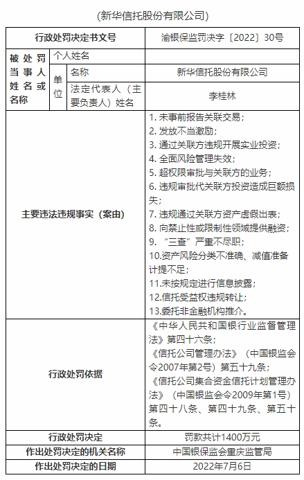銀保監(jiān)會網(wǎng)站今日公布了重慶銀保監(jiān)局行政處罰信息公開表(渝銀保監(jiān)罰決字〔2022〕30號、16號、18號、19號、20號、21號、22號、23號、24號、25號、26號、27號、28號、29號、31號、32號)顯示,新華信托股份有限公司存在13宗主要違法違規(guī)事實:未事前報告關(guān)聯(lián)交易;發(fā)放不當(dāng)激勵;通過關(guān)聯(lián)方違規(guī)開展實業(yè)投資;全面風(fēng)險管理失效;超權(quán)限審批與關(guān)聯(lián)方的業(yè)務(wù);違規(guī)審批代關(guān)聯(lián)方投資造成巨額損失;違規(guī)通過關(guān)聯(lián)方資產(chǎn)虛假出表;向禁止性或限制性領(lǐng)域提供融資;“三查”嚴(yán)重不盡職;資產(chǎn)風(fēng)險分類不準(zhǔn)確、減值準(zhǔn)備計提不足;未按規(guī)定進(jìn)行信息披露;信托受益權(quán)違規(guī)轉(zhuǎn)讓;委托非金融機構(gòu)推介。