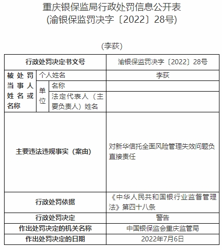 李荻對新華信托全面風(fēng)險管理失效問題負(fù)直接責(zé)任。依據(jù)《中華人民共和國銀行業(yè)監(jiān)督管理法》第四十八條,中國銀保監(jiān)會重慶監(jiān)管局對其警告。
