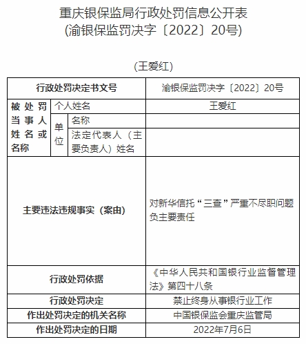 王愛紅對新華信托“三查”嚴(yán)重不盡職問題負(fù)主要責(zé)任。依據(jù)《中華人民共和國銀行業(yè)監(jiān)督管理法》第四十八條,中國銀保監(jiān)會重慶監(jiān)管局對其禁止終身從事銀行業(yè)工作。