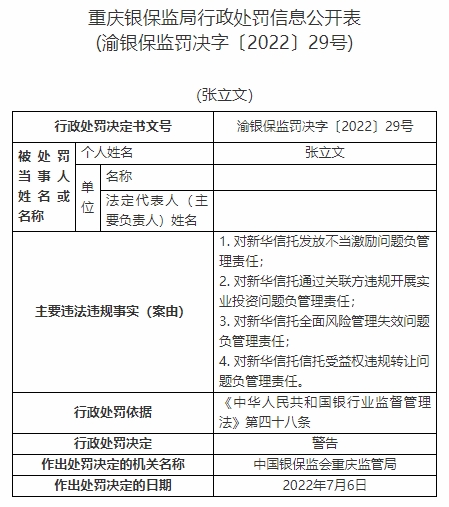 張立文對新華信托發(fā)放不當(dāng)激勵問題負(fù)管理責(zé)任、對新華信托通過關(guān)聯(lián)方違規(guī)開展實業(yè)投資問題負(fù)管理責(zé)任、對新華信托全面風(fēng)險管理失效問題負(fù)管理責(zé)任、對新華信托信托受益權(quán)違規(guī)轉(zhuǎn)讓問題負(fù)管理責(zé)任。依據(jù)《中華人民共和國銀行業(yè)監(jiān)督管理法》第四十八條,中國銀保監(jiān)會重慶監(jiān)管局對其警告。