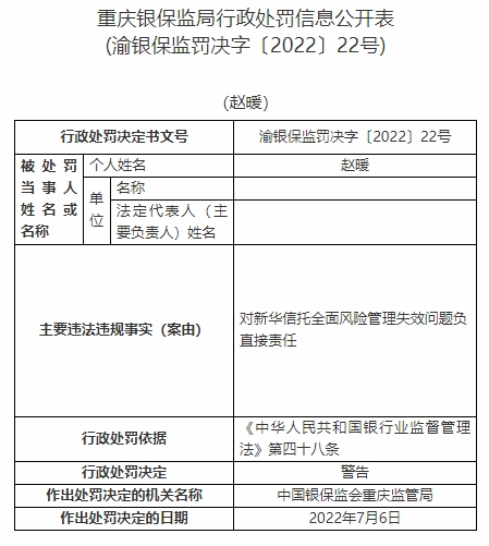 趙暖對新華信托全面風(fēng)險管理失效問題負(fù)直接責(zé)任。依據(jù)《中華人民共和國銀行業(yè)監(jiān)督管理法》第四十八條,中國銀保監(jiān)會重慶監(jiān)管局對其警告。