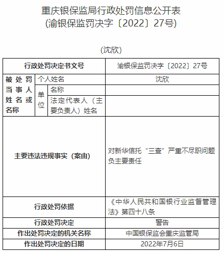 沈欣對新華信托“三查”嚴(yán)重不盡職問題負(fù)主要責(zé)任。依據(jù)《中華人民共和國銀行業(yè)監(jiān)督管理法》第四十八條,中國銀保監(jiān)會重慶監(jiān)管局對其警告。