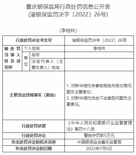 李桂林對新華信托未事前報告關(guān)聯(lián)交易問題負(fù)主要責(zé)任、對新華信托發(fā)放不當(dāng)激勵問題負(fù)主要責(zé)任。依據(jù)《中華人民共和國銀行業(yè)監(jiān)督管理法》第四十八條,中國銀保監(jiān)會重慶監(jiān)管局對其警告并罰款5萬元。
