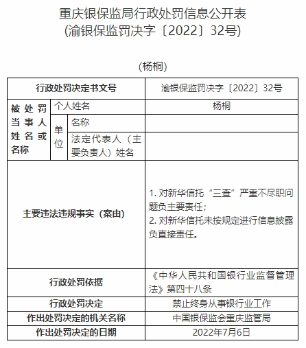 楊桐對新華信托“三查”嚴(yán)重不盡職問題負(fù)主要責(zé)任、對新華信托未按規(guī)定進(jìn)行信息披露負(fù)直接責(zé)任。依據(jù)《中華人民共和國銀行業(yè)監(jiān)督管理法》第四十八條,中國銀保監(jiān)會重慶監(jiān)管局對其禁止終身從事銀行業(yè)工作。