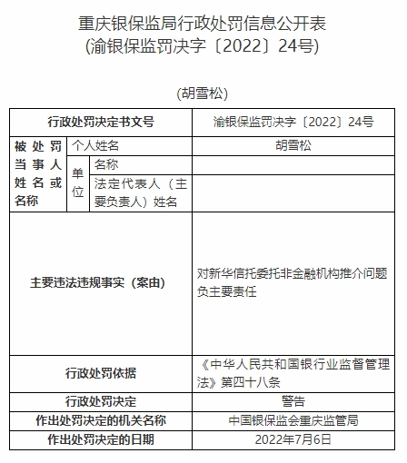 胡雪松對新華信托委托非金融機構(gòu)推介問題負(fù)主要責(zé)任。依據(jù)《中華人民共和國銀行業(yè)監(jiān)督管理法》第四十八條,中國銀保監(jiān)會重慶監(jiān)管局對其警告。