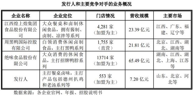 在招股書中,德州扒雞將休閑鹵制品企業(yè)煌上煌、周黑鴨、絕味食品列為行業(yè)內主要競爭對手。需要注意的是,不論是營收規(guī)模還是門店數量,德州扒雞都遠不及這些競爭對手。