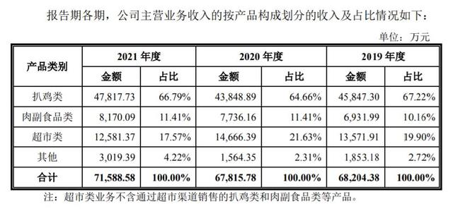 德州扒雞另一大收入來源則是超市類業(yè)務(不含通過超市渠道銷售的扒雞類和肉副食品類等產品),2019年至2021年分別實現收入1.35億元、1.47億元、1.26億元,占比19.90%、21.63%、17.57%。