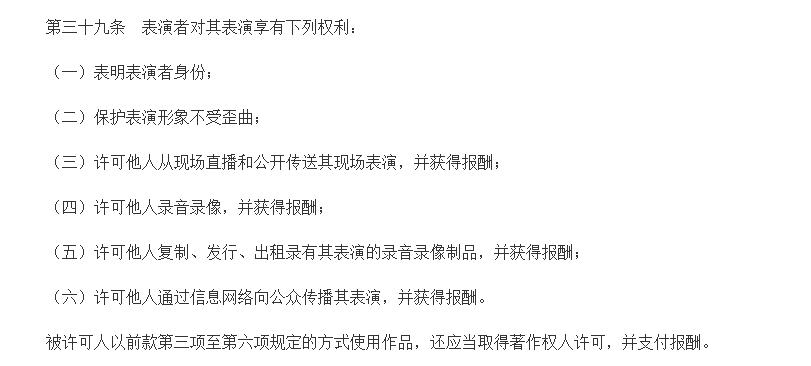 根據(jù)著作權(quán)法第三十九條,表演者享有以下權(quán)利: