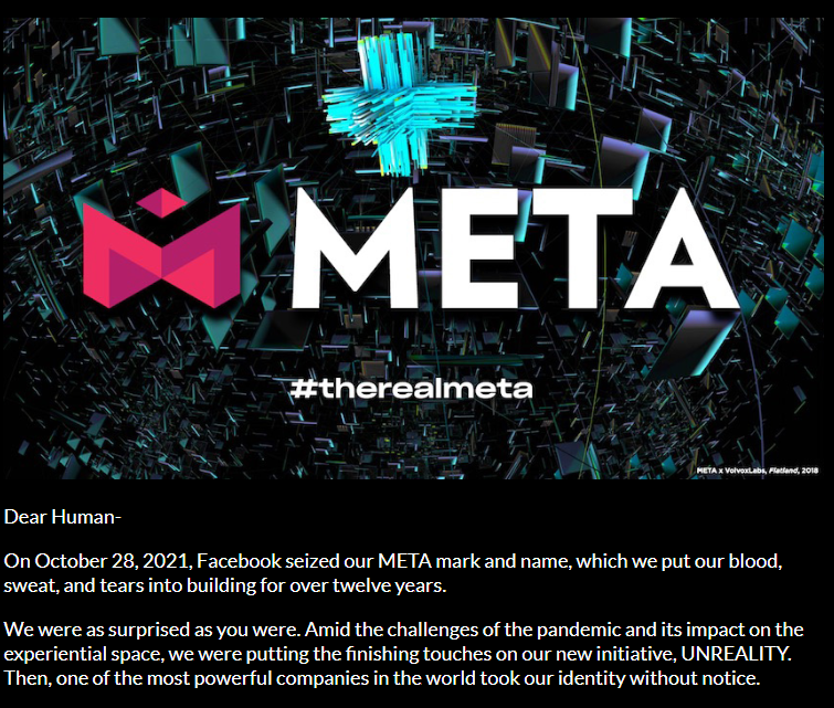同時(shí),小Meta的CEO還發(fā)表博客文章控訴道:“2021年10月28日,F(xiàn)acebook獲得了我們的META標(biāo)志和名稱,這是我們十二年來(lái)用自己的血、汗和眼淚建立起來(lái)的。我們和你們一樣驚訝……世界上最強(qiáng)大的公司之一在未告知的情況下奪走了我們的身份?!?/p>