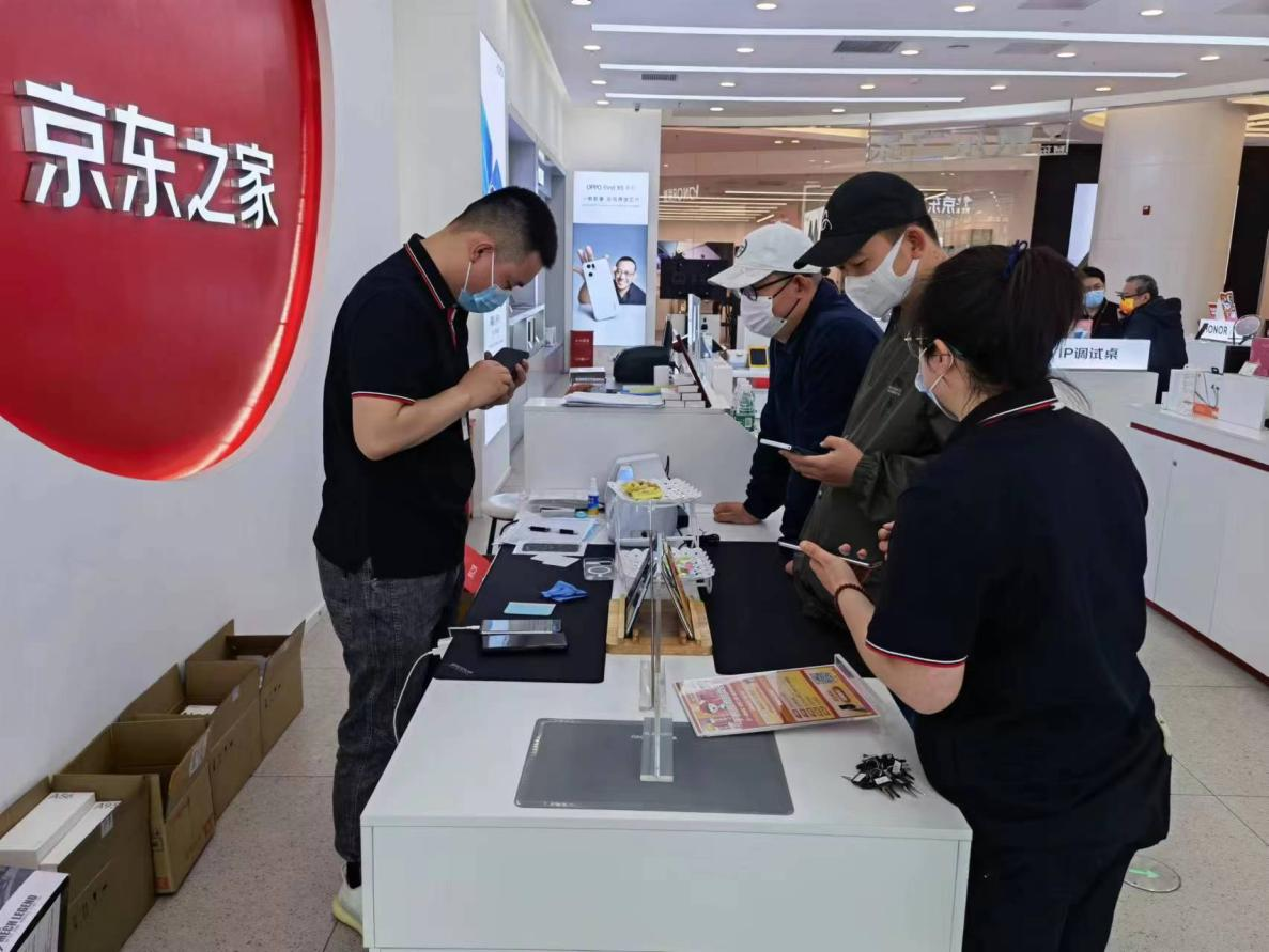 消費(fèi)者在京東之家線(xiàn)下門(mén)店體驗(yàn)手機(jī)以舊換新服務(wù)
