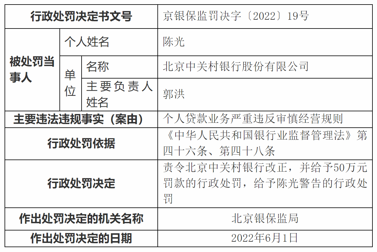 據(jù)銀保監(jiān)會網(wǎng)站消息,近日北京銀保監(jiān)局對北京中關(guān)村銀行開出罰單,針對個人貸款業(yè)務(wù)嚴重違反審慎經(jīng)營規(guī)則的違法違規(guī)行為,責令該行改正,罰款50萬元,并對責任人陳光進行警告。