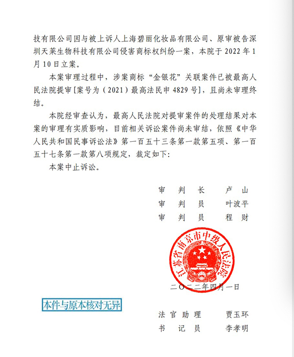 如4月1日,江蘇南京中院基于“金銀花”關(guān)聯(lián)案件已被最高法提審,決定中止審理上訴人南京三盾藥業(yè)有限公司、青島海氏海諾英諾威消毒科技有限公司與被上訴人上海碧麗化妝品有限公司案?!白罡呷嗣穹ㄔ簩μ釋彴讣奶幚斫Y(jié)果對本案的審理有實質(zhì)影響,目前相關(guān)訴訟案件尚未審結(jié),依法裁定本案中止訴訟?!辈枚〞Q。