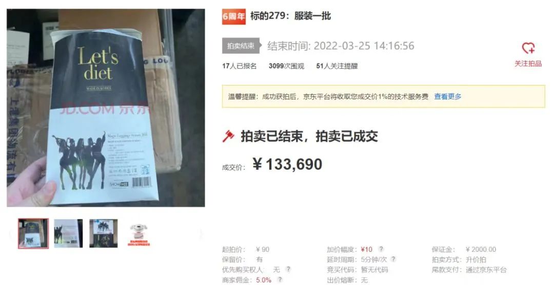 據(jù)統(tǒng)計(jì),本次拍賣專場共有1.5萬名用戶設(shè)置了關(guān)注提醒,總圍觀次數(shù)超過了44萬次,參拍用戶共3034名,累計(jì)競價(jià)次數(shù)3萬多次。其中“標(biāo)的279:服裝一批”起拍價(jià)90元,貨量超9000件,最終成交價(jià)13.37萬元,溢價(jià)率高達(dá)148倍,為本次拍賣會溢價(jià)率最高的標(biāo)的?!皹?biāo)的286:油畫一批”包括18幅創(chuàng)作精美的畫作,競價(jià)次數(shù)達(dá)到了761次,成了本場拍賣會“最受買家青睞”的拍品。