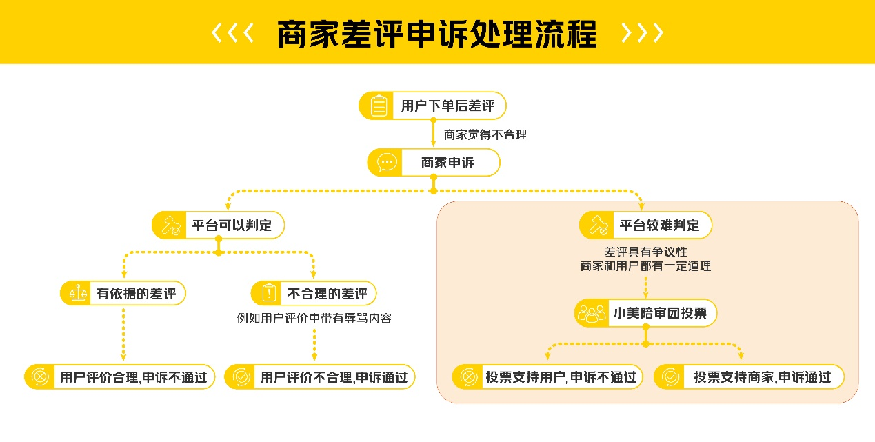 為了保障用戶合理評價權(quán)益、避免商家遭受不合理差評的影響,美團外賣升級迭代產(chǎn)品功能,引入公眾評審機制——小美陪審團。用戶和商家之間如果出現(xiàn)爭議差評,且雙方難以主動達(dá)成和解時,熱心的社會公眾、用戶和商家都可以報名作為評審員,根據(jù)用戶和商家雙方提供的材料判斷,并對爭議差評進行投票判定。