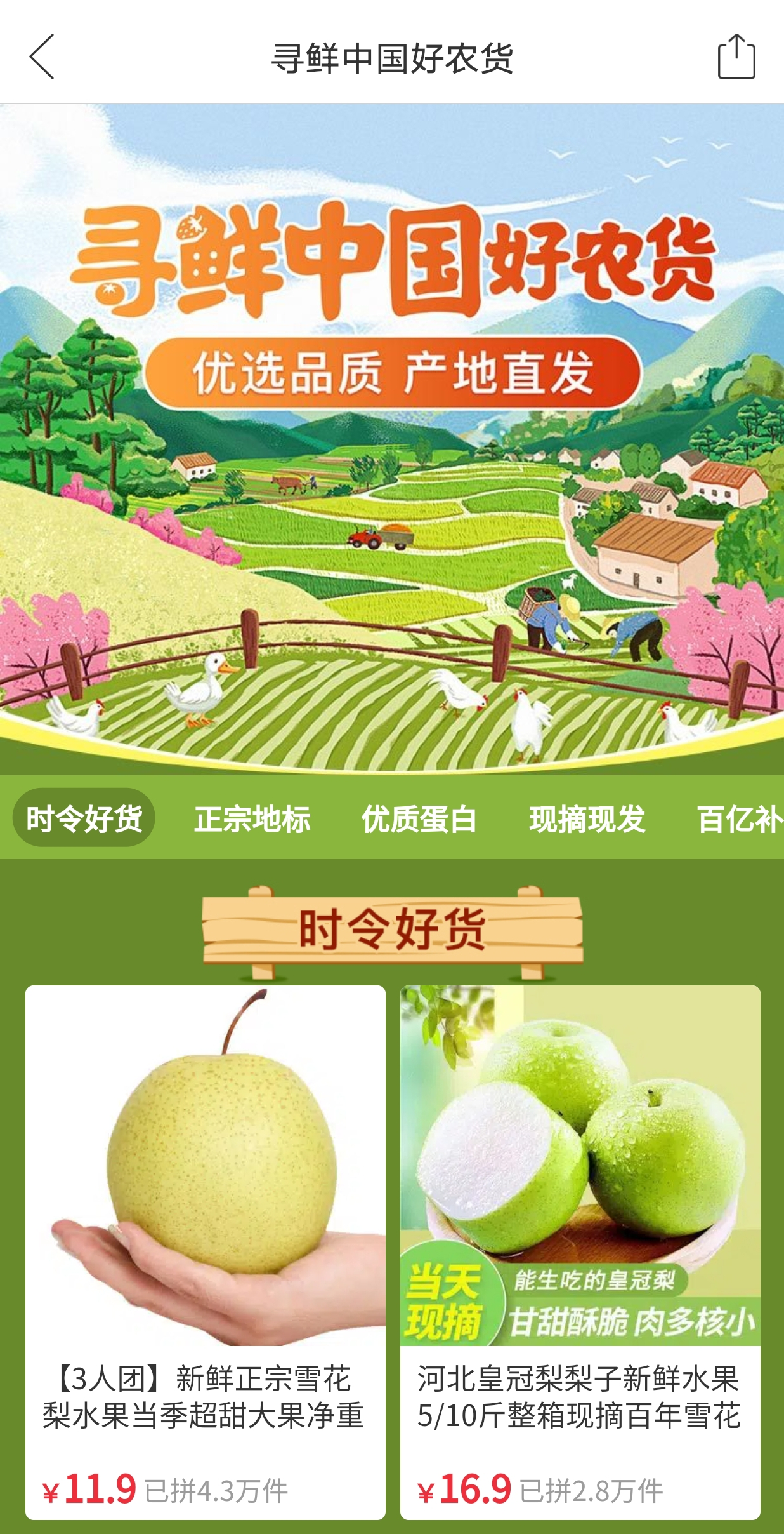 活動期間,消費(fèi)者打開拼多多app,搜索“尋鮮中國”“多多好農(nóng)貨”“好農(nóng)貨”等關(guān)鍵詞,即可直達(dá)專區(qū),選購時(shí)令地標(biāo)農(nóng)貨。